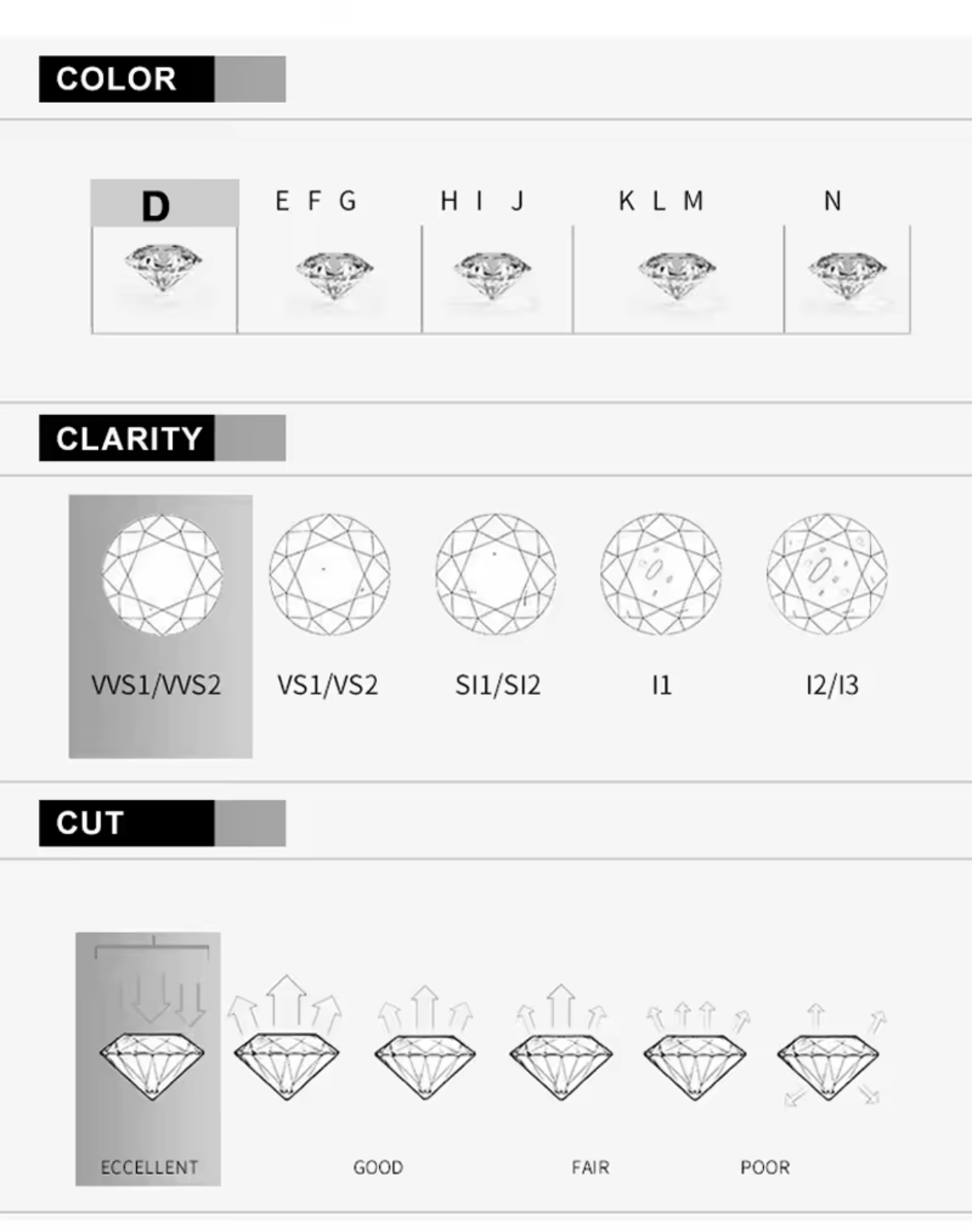 - Kolor kamienia: D (bezbarwny – najwyższy stopień)